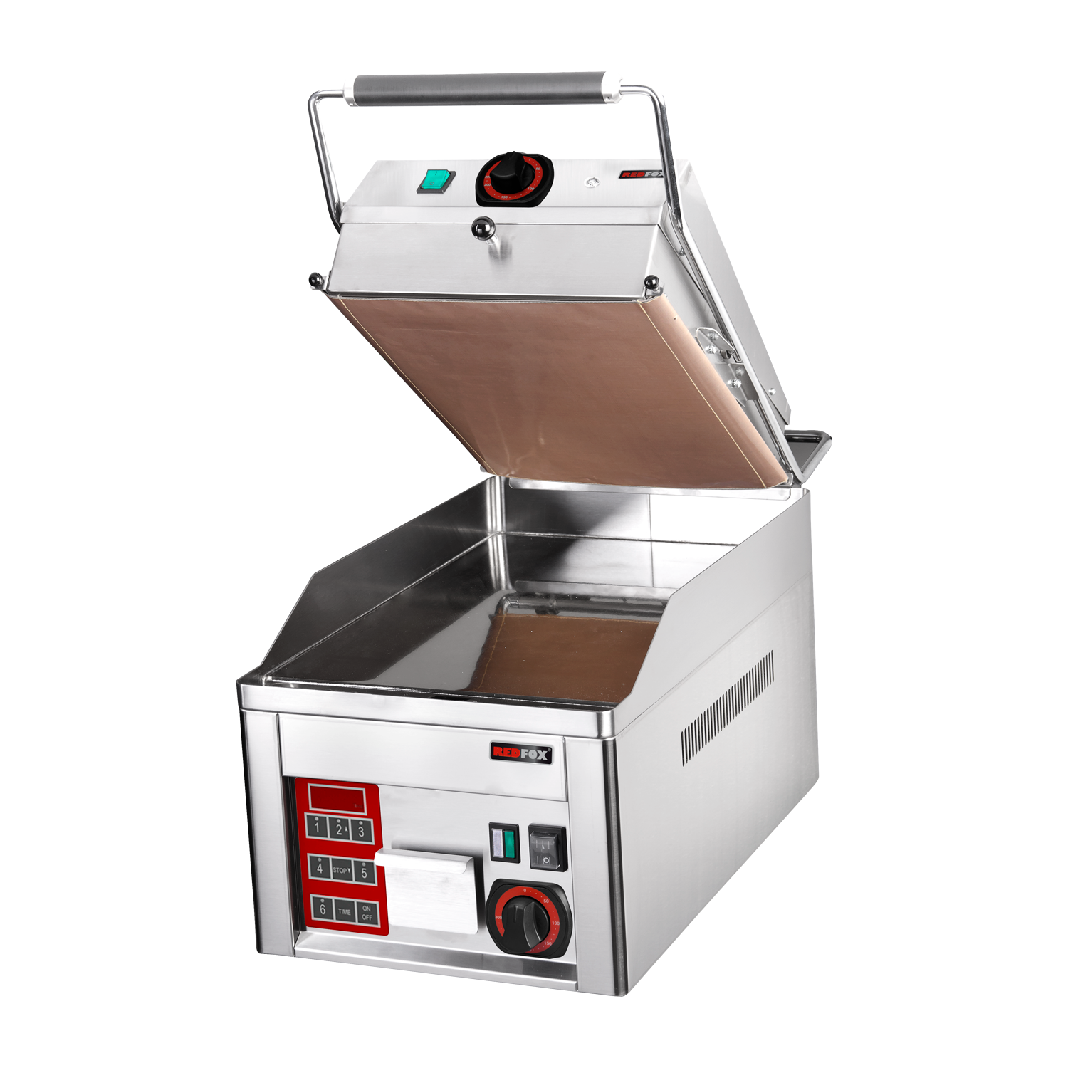 • Plaque Supérieure (Presse) : Équipée d'une feuille de Téflon antiadhésive (facilement remplaçable) pour empêcher les aliments de coller.